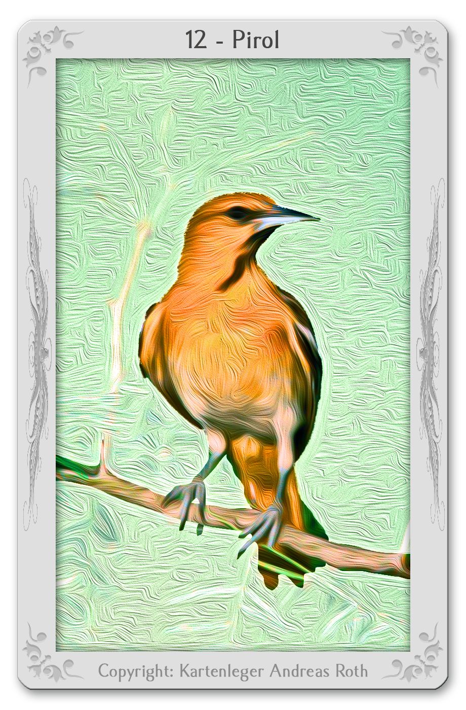 Der Pirol deutet immer auf eine hektische Betriebsamkeit hin, die sich aber schnell wieder legt. Die Gründe für die Nervosität oder auch Unruhe ergeben sich aber erst aus der Betrachtung der umliegenden Karten. In ganz engem Zusammenhang mit dem Pirol steht ein Telefonat und das Schwatzen und Tratschen.